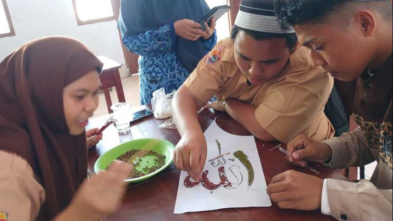 Dalam kegiatan ini mereka dibagi menjadi enam kelompok, masing-masing kelompok telah menyiapkan alat yang dibutuhkan berupa gunting, karton, pensil, kuas, lem putih, biji kacang hijau dan biji kacang merah. Selanjutnya mereka mulai mempraktikkan membuat sketsa huruf-huruf hijaiyah pada kertas, kemudian ditulis bersambung hingga bertuliskan Asmaul Husna lalu diberi lem putih tipis-tipis pada sketsa huruf. Selanjutnya dengan pelan-pelan mereka menaburkan biji kacang hijau secara merata sambil menekan dengan pelan agar biji kacang hijau tadi tidak mudah lepas.